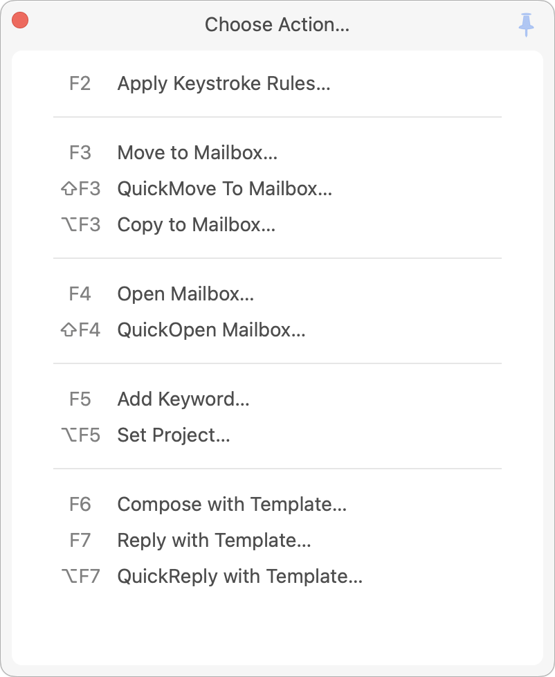 Mail Actions enable you to process messages in various ways using a pop-up window that can be controlled entirely from the keyboard if you like. This window takes any of several different forms, depending on how you invoke it.