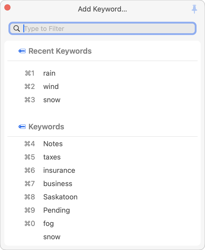 icon, choosing Message > Set Tags, or pressing ⌃⌘T. Yet another way is to call up the Add Keyword panel by pressing F5.