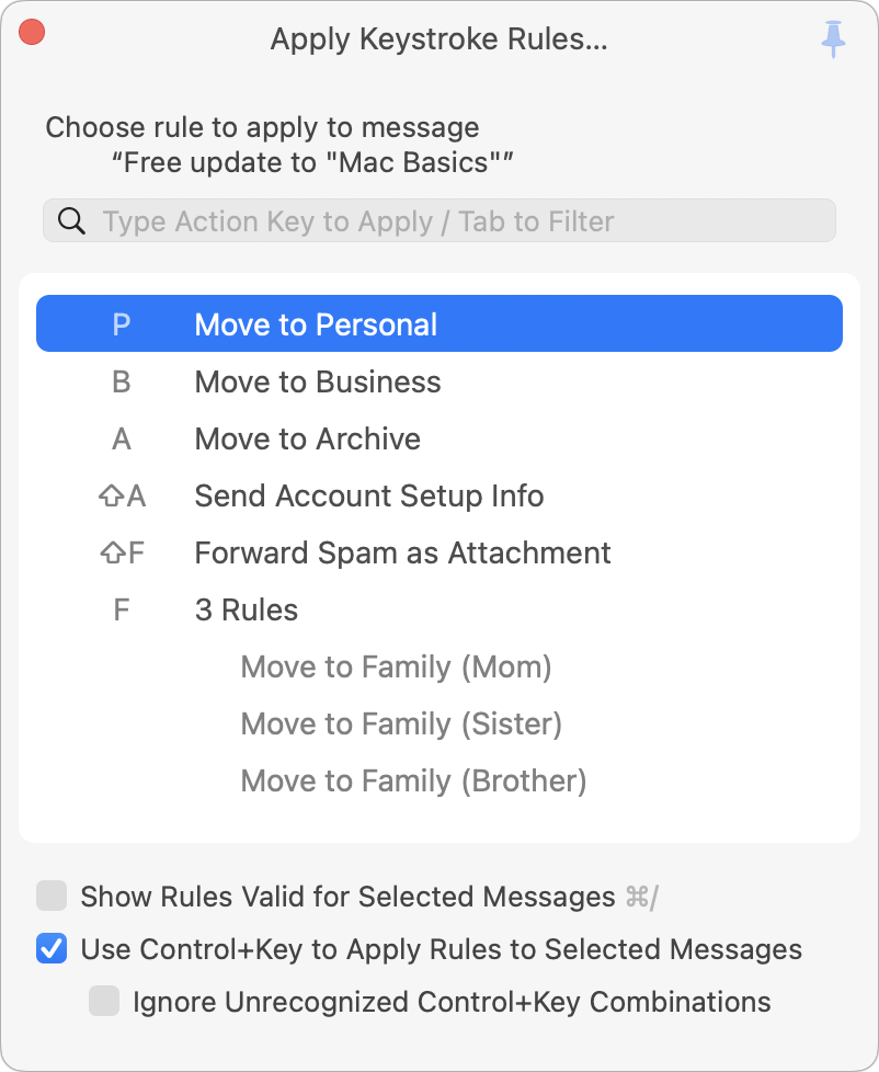 You can create any number of Keystroke Rules, which are just like inbox and outbox rules except that instead of applying automatically on incoming or outgoing messages, they apply only when you press a user-defined keyboard shortcut. If you forget which keyboard shortcuts you’ve set, you can open the Apply Keystroke Rules panel by pressing F2. Then use the arrow keys (or type in the Search field to find a rule) to select a keystroke rule and press Return to apply it.