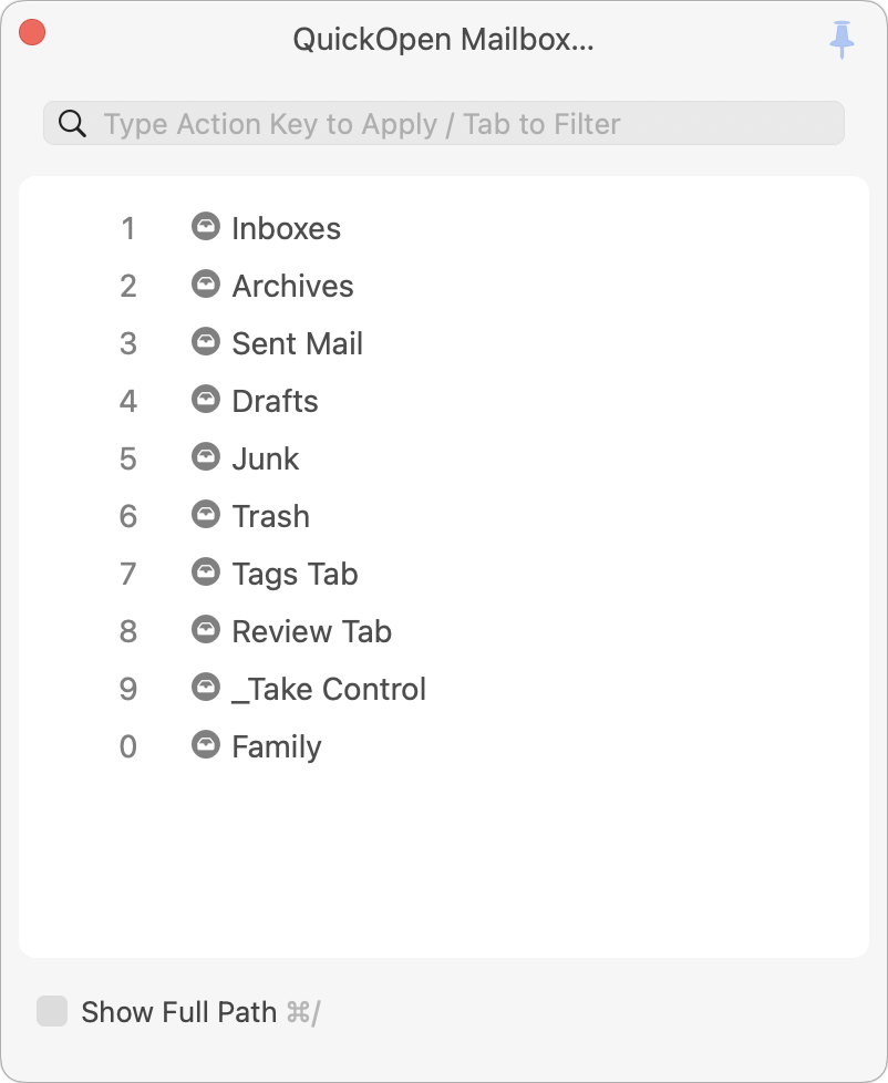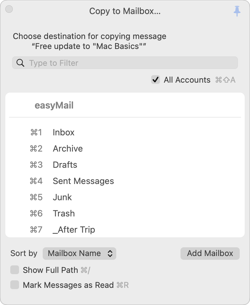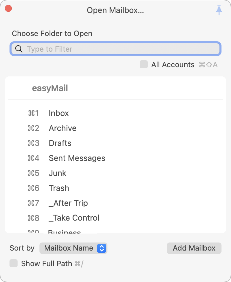 Optionally type part of the mailbox name to filter the list, then press the keyboard shortcut next to a mailbox, select it in the list using your mouse, or use the arrow keys and then press Return.