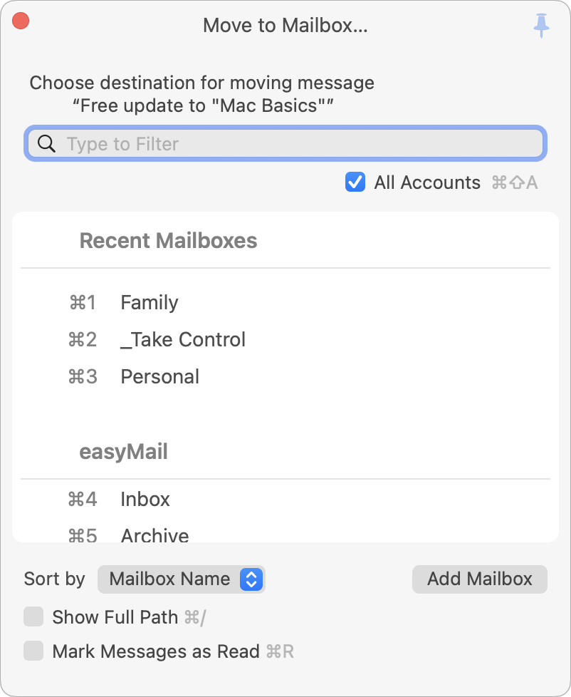 MailMaven lets you move any message to any mailbox quickly—in any account, no matter how deeply nested, and even if you don’t remember where that mailbox is. With one or more messages selected, press F3 to open the Move to Mailbox panel.
