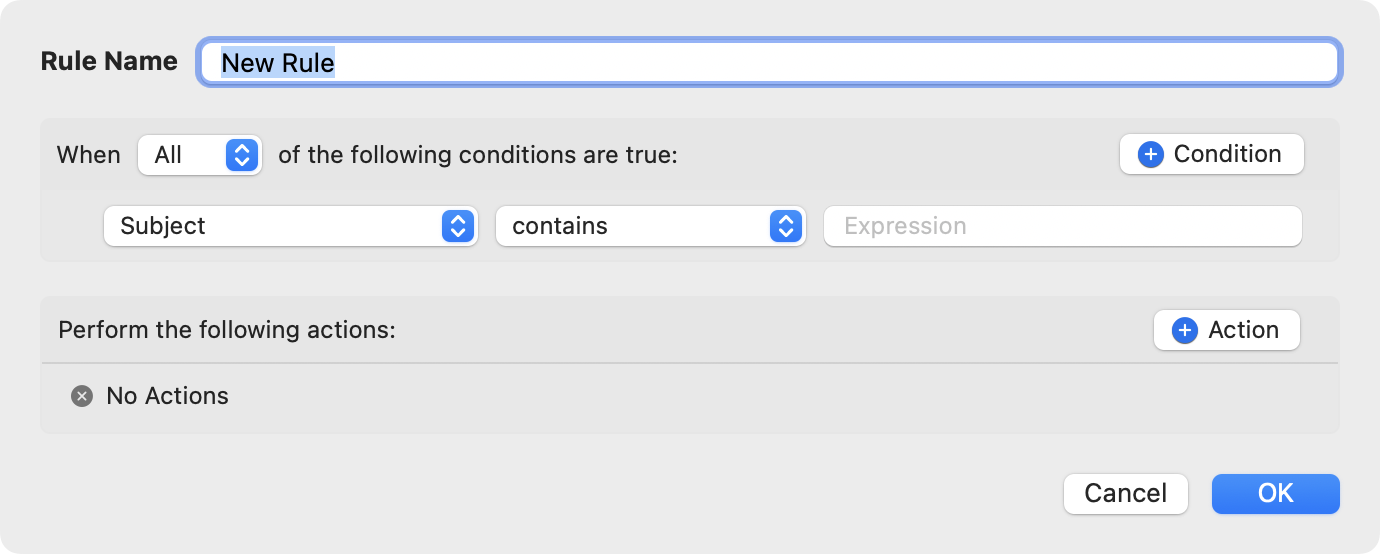 Rules should be familiar to anyone who has used Apple Mail, Microsoft Outlook, Gmail, or other popular email apps. A rule is simply a description of what condition(s) to look for in a message (such as a particular subject or sender, or a phrase in the body of the message) and what action(s) to perform when a message matches that description (delete the message, file it in a particular mailbox, or send a boilerplate reply, say).