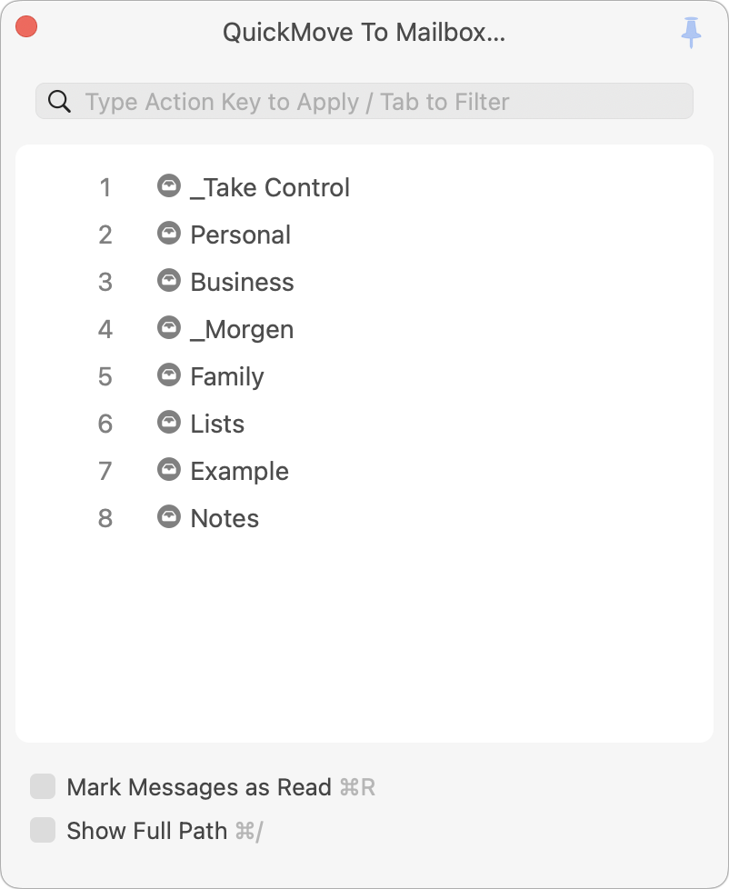 The QuickMove to Mailbox panel (Shift-F3) is like a streamlined version of the Move to Mailbox panel: it contains only the mailboxes (up to 10) you’ve designated as the ones you use most often in Settings > Process > Message Filing > QuickMove Mailboxes.
